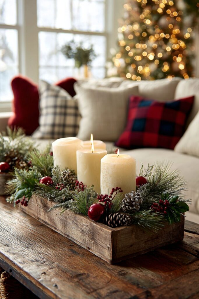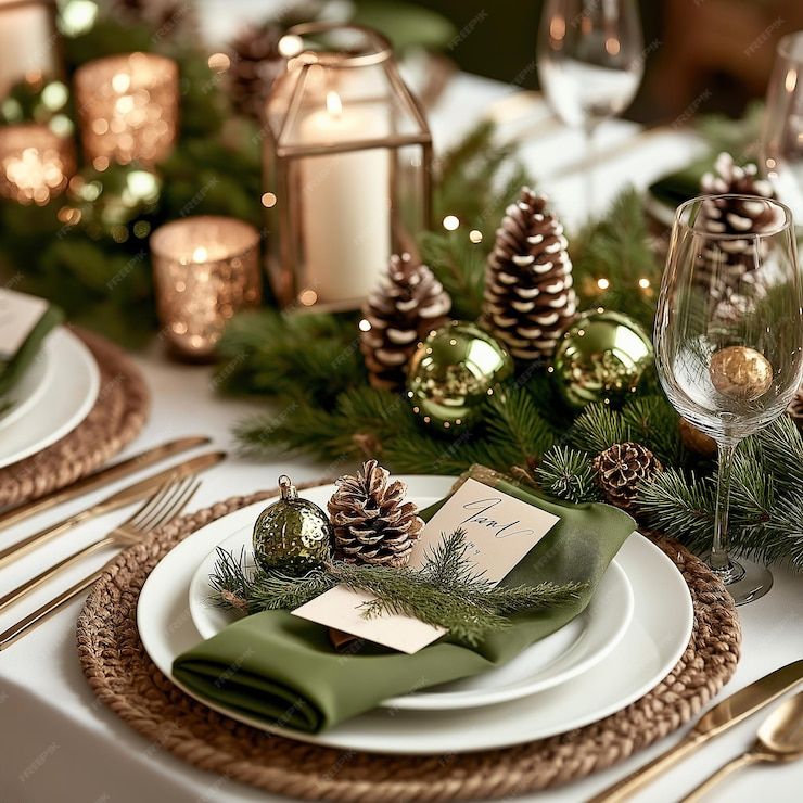 - arranjos orgânicos com folhagens verdes, ramos de pinheiro, flores da estação;